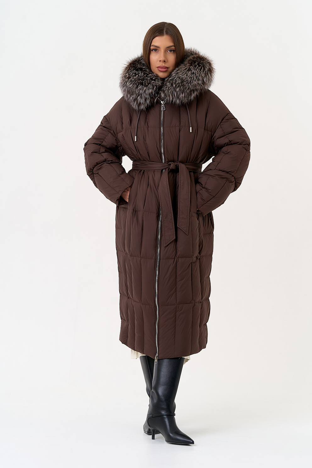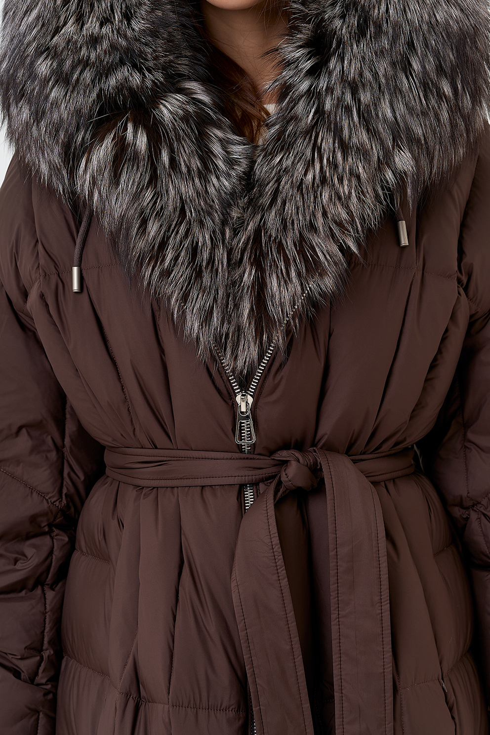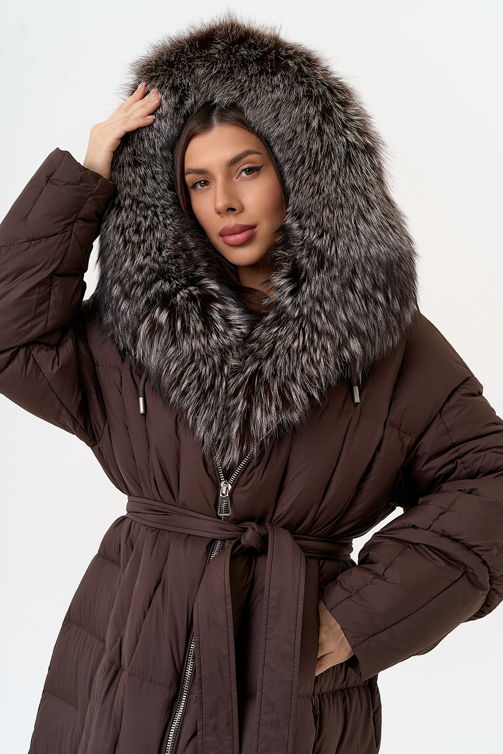 Крой воротника - капюшон, отделка чернобурая лиса