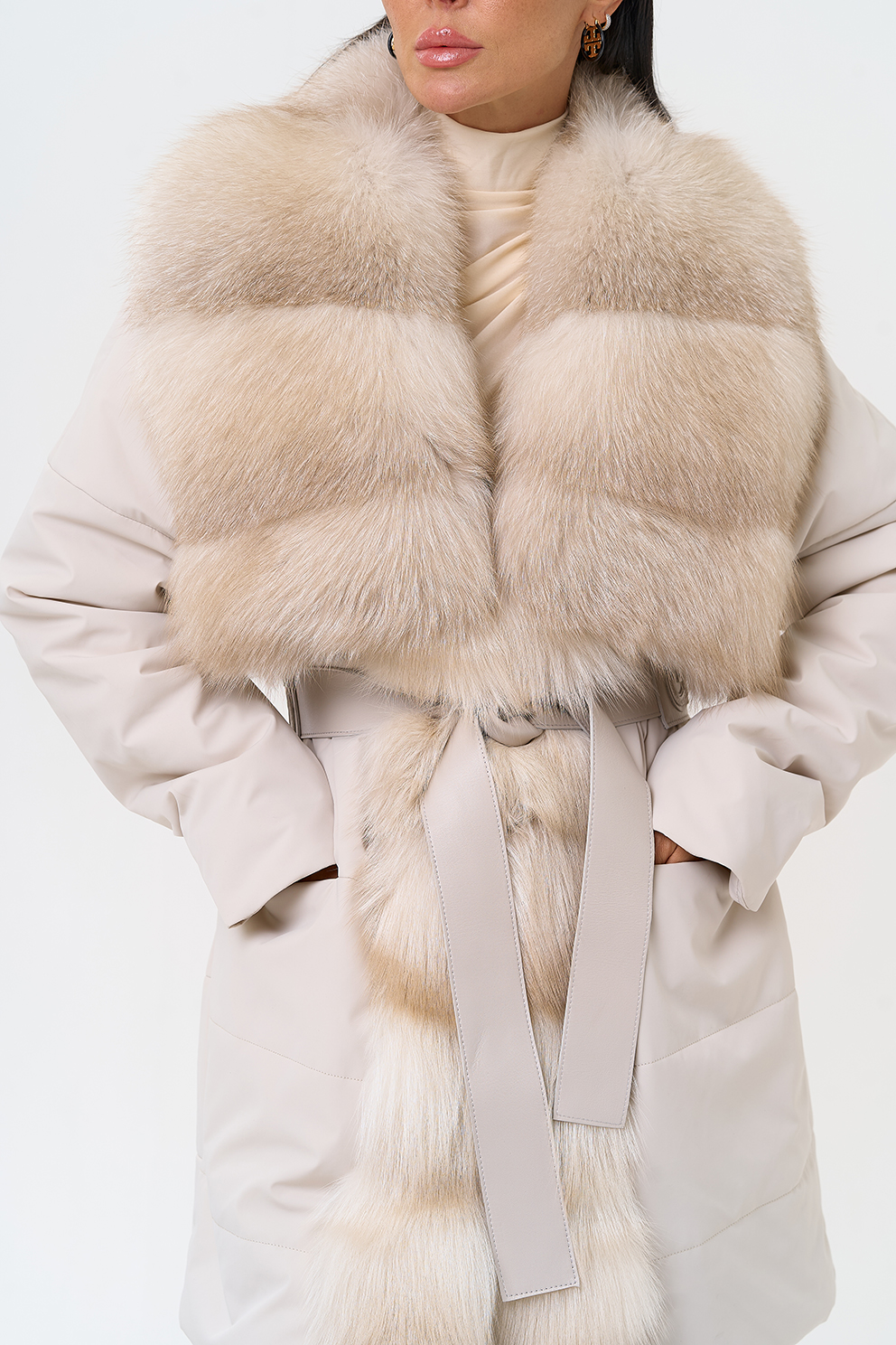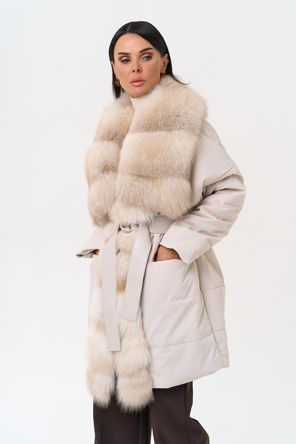 Вид застежки - кнопки, брендированный пояс из натуральной кожи