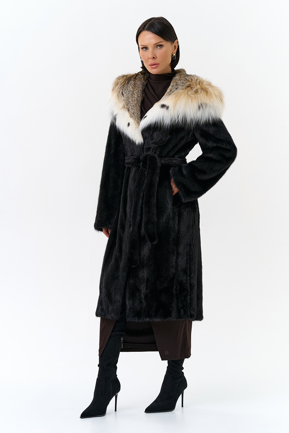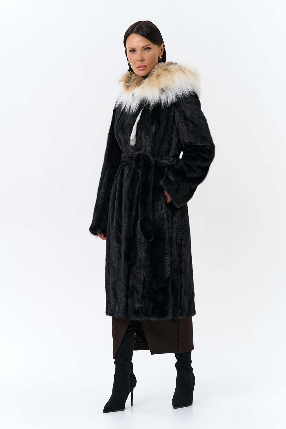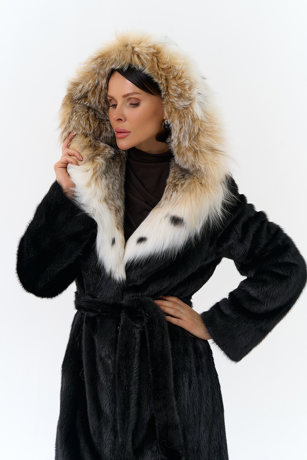 Норковая шуба с капюшоном с отделкой из рыси