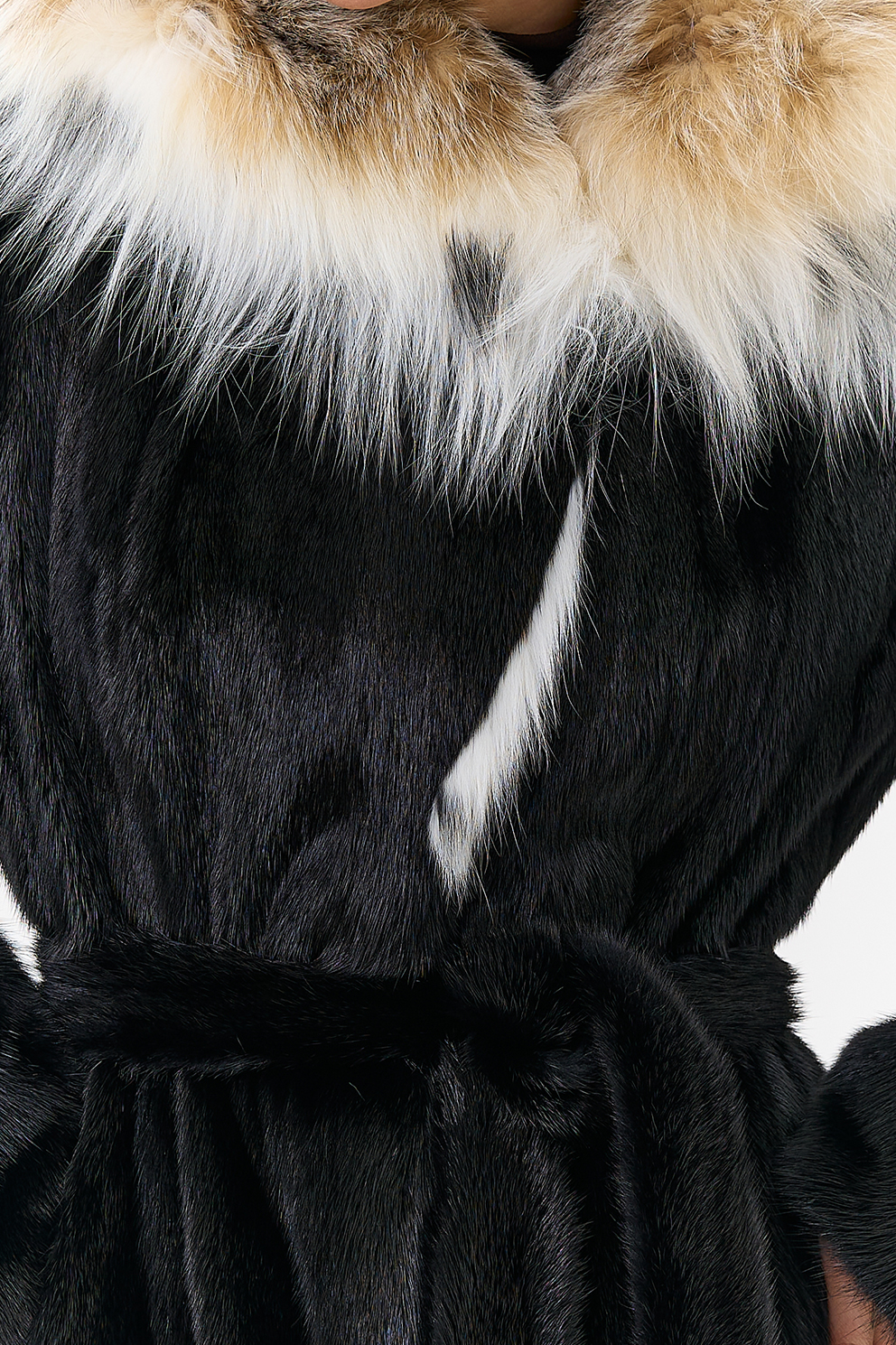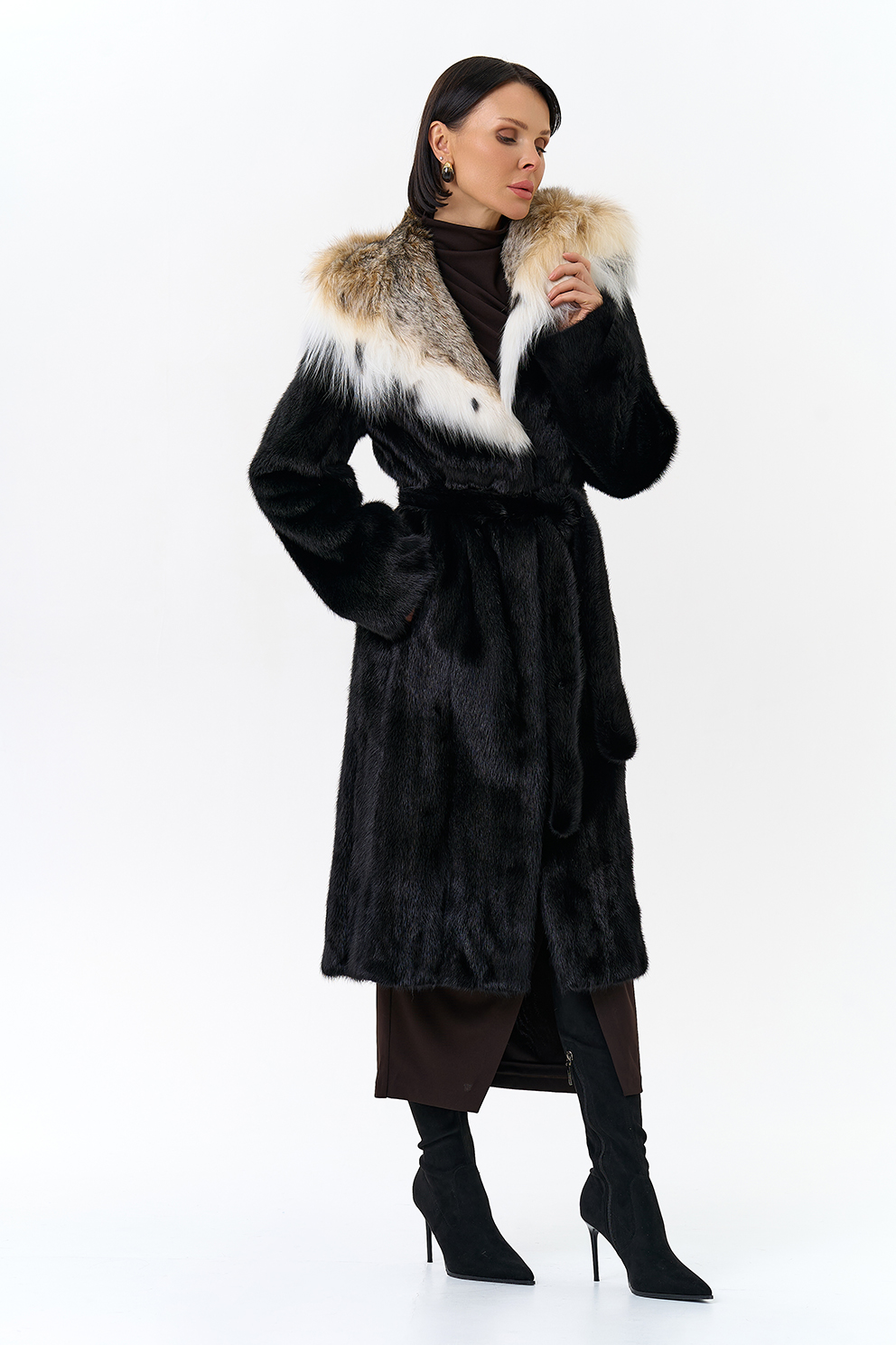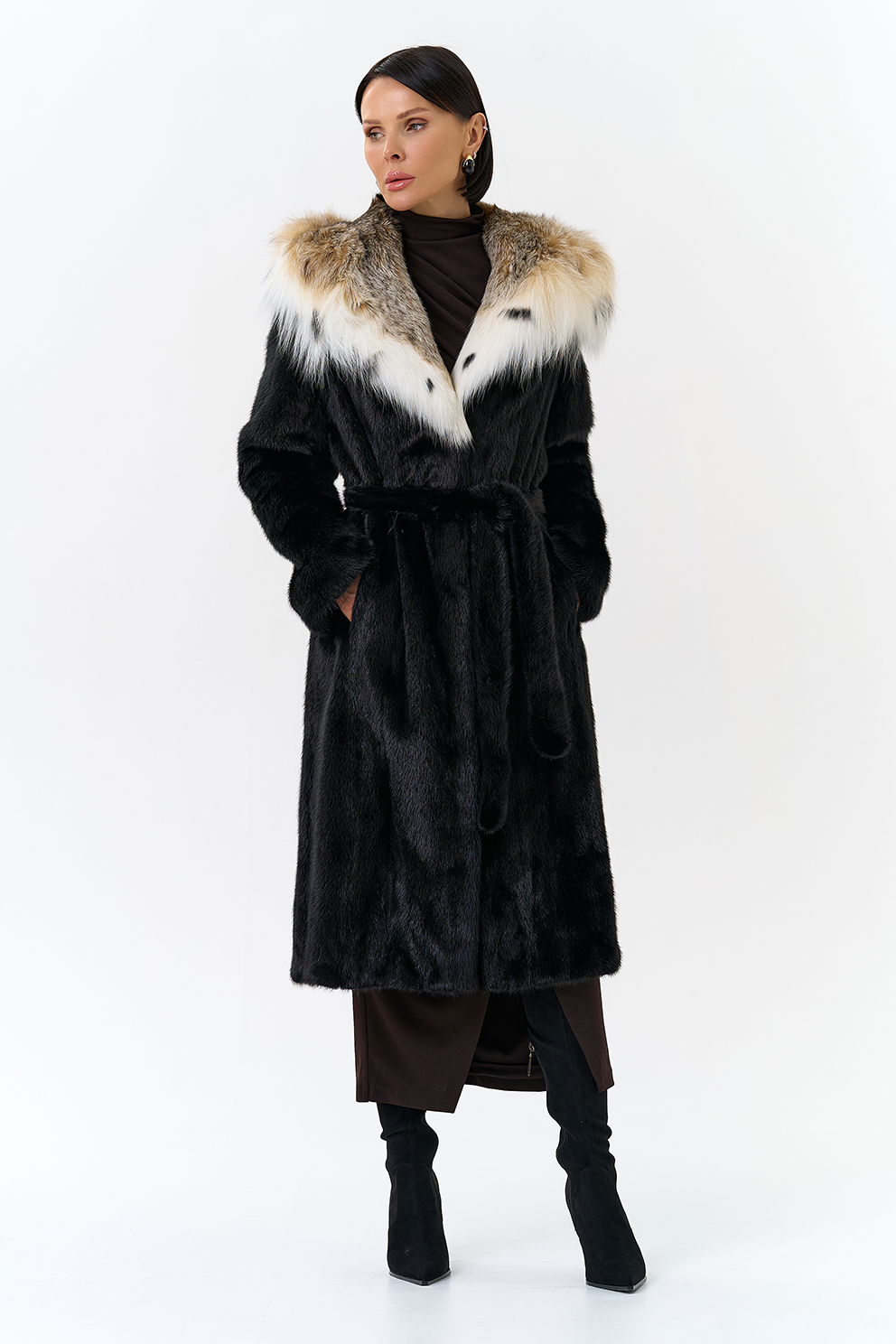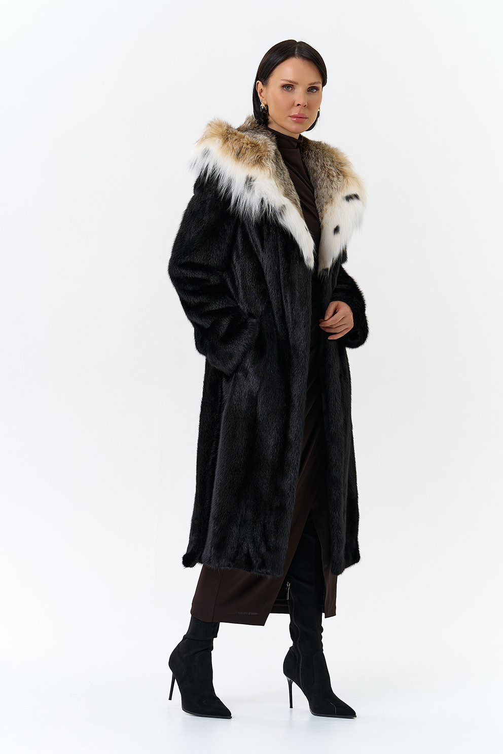Норковая шуба с капюшоном с отделкой из рыси